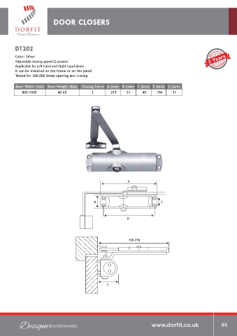Door Width (mm) Door Weight (Kgs) Closing Force A (mm) B (mm) C (mm) D (mm) E (mm) Door Width (mm) Door Weight (Kgs) Closing Force A (mm) B (mm) C (mm) D (mm) E (mm)