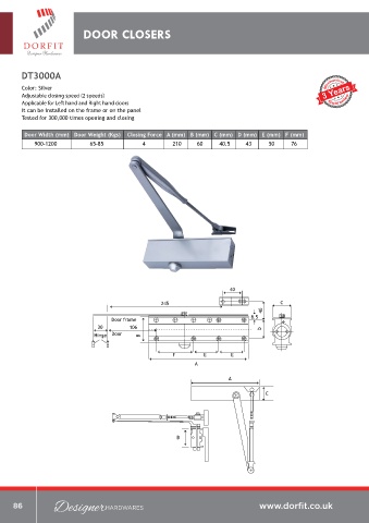 Door Width (mm) Door Weight (Kgs) Closing Force A (mm) B (mm) C (mm) D (mm) E (mm) F (mm) Tested for 300,000 times opening and closing