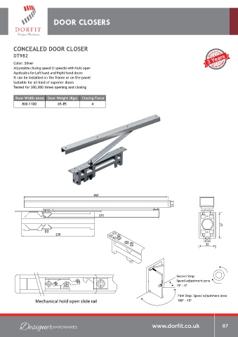 Applicable for Left hand and Right hand doors Adjustable closing speed (2 speeds) with hold open